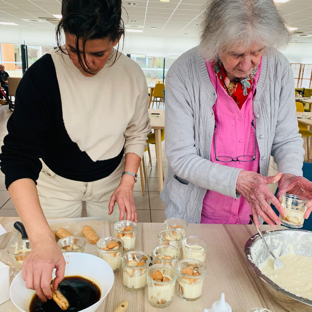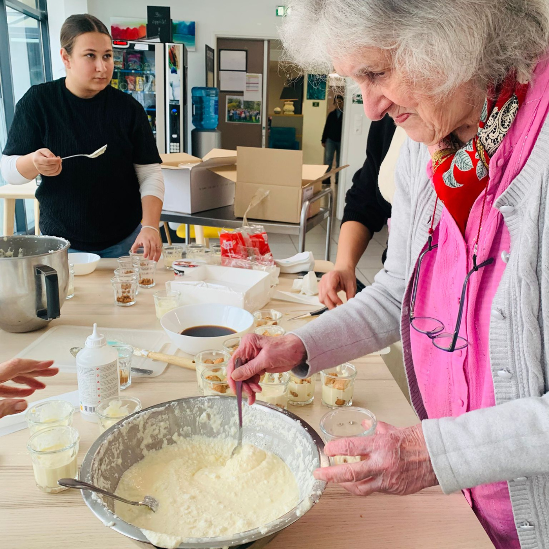 Nos résidents seniors ont récemment enfilé leurs tabliers pour participer à un atelier pâtisserie placé sous le signe de la gourmandise : la réalisation d’un savoureux tiramisu maison.