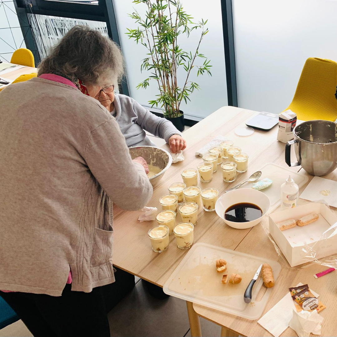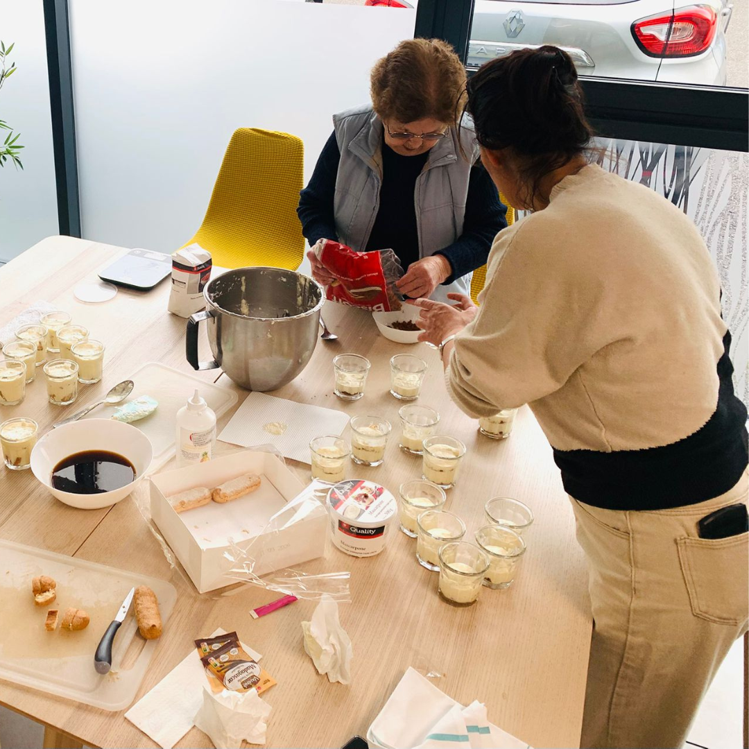 Sous les conseils de notre équipe, les personnes âgées ont suivi pas à pas les différentes étapes de la recette : préparation de la crème onctueuse au mascarpone, imbibage délicat des biscuits, montage soigné des couches…